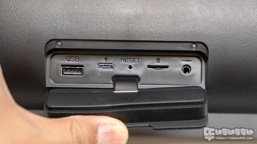 입력 단자는 USB 입력 / USB-C 충전 단자, 리셋 버튼, MicroSD 슬롯, AUX 입력 단자로 구성되어 있습니다.