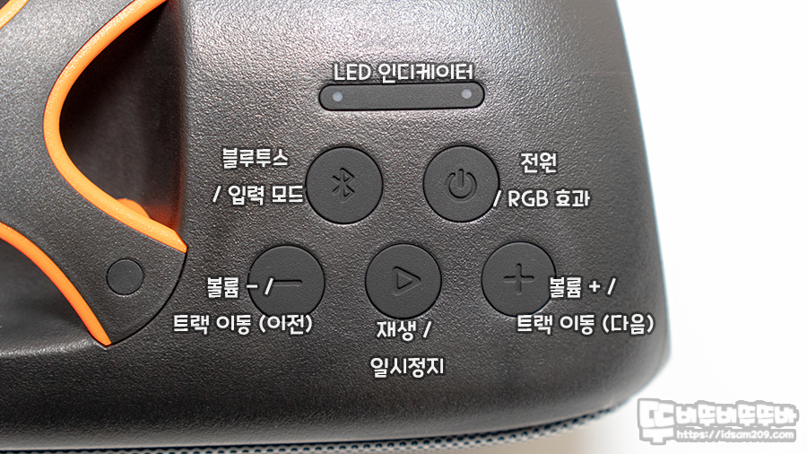 제품의 오른쪽 부분 위에는 버튼 방식의 3 버튼 컨트롤 기능을 메인으로 하여 재생/일시정지, 트랙 및 볼륨 조절을 담당하며 추가로 전원 버튼 (서브로 RGB 효과 버튼)과 입력 모드를 선택하는 버튼으로 심플하게 구성하여 사용하는데 큰 불편함은 없는 편입니다.