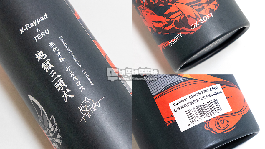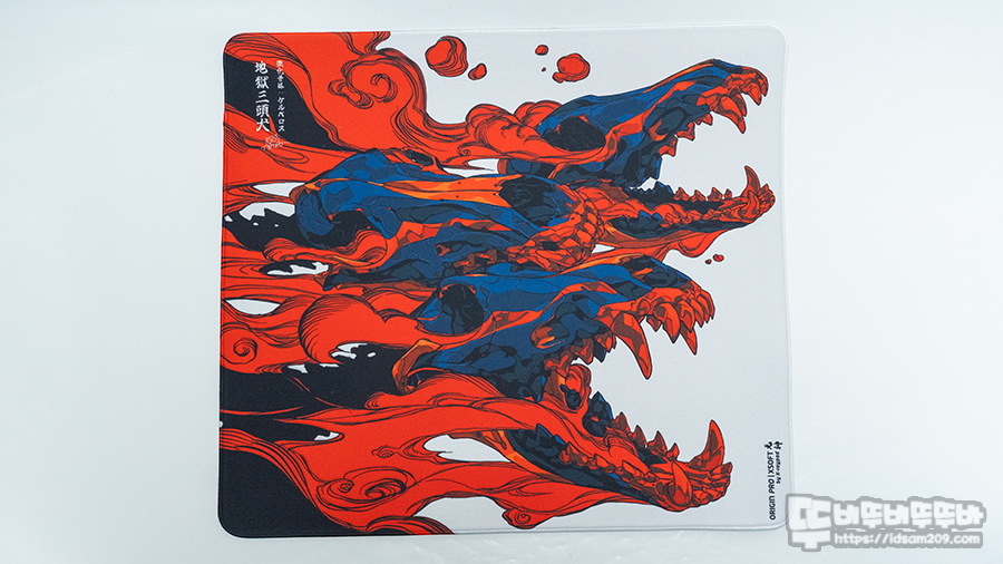 패드 표면에는 Teru 작가의 케르베로스 이미지에 왼쪽 상단에 지옥 삼두대 / 강화 공력 : 케르바로스 / 작가 사인 그리고 오른쪽 하단에는 Origin Pro / Xsoft 인쇄를 확인할 수 있습니다.