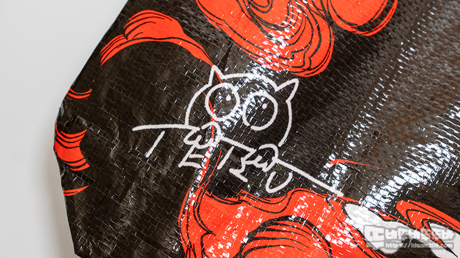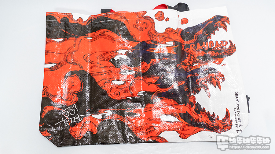 케르베로스 이미지가 강렬하게 인쇄되어 있는 리유저블백은 우리가 보통 접하는 폴리프로필렌 소재를 사용하여 가벼우며 접어서 휴대가 가능한 게 특징인데요.