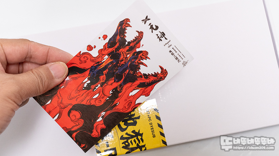 마지막으로 한정판 X-RAYPAD 케르베로스 키캡은 PBT 소재와 PC 소재가 사용되었으며 PBT 소재의 경우 TERU 작가의 이미지가 고급스럽게 각인되어 있는 게 특징입니다.
