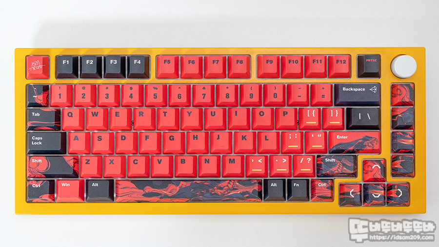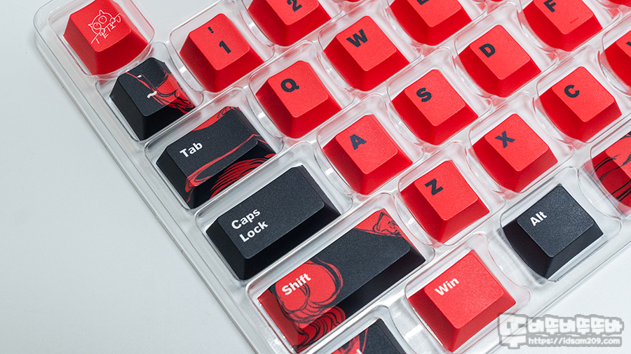 레드 컬러 문자열과 블랙 포인트 키캡으로 구성된 F 펑션 열과 일부 모디키 그리고 케르베로스 이미지가 인쇄된 키캡과 PC 재질의 투명 키캡으로 구성되어 있어 취향에 맞게 사용할 수 있습니다.