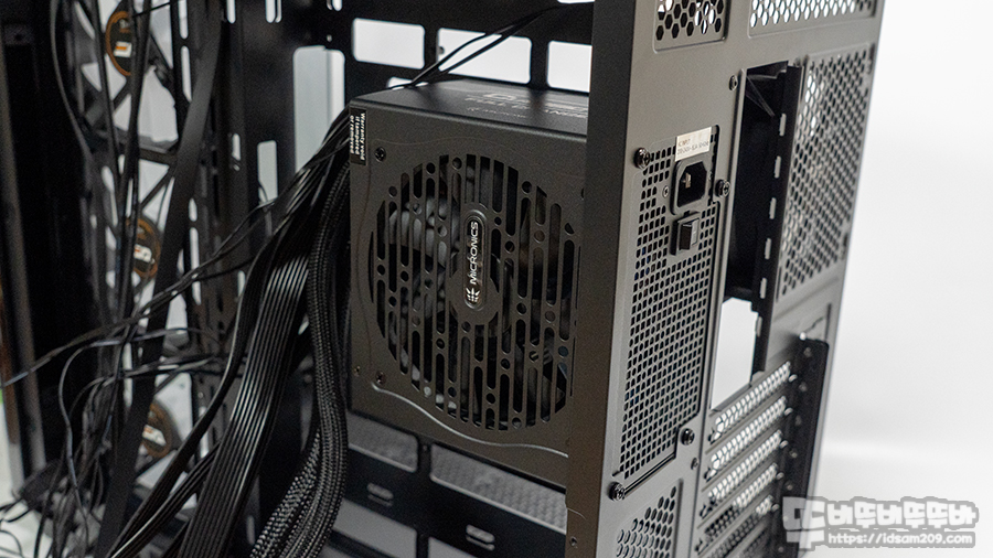 케이스 중간 위치에 장착되는 파워서플라이는 메인보드 24핀 메인 전원 커넥터 및 8핀 보조전원 케이블을 연결하는데 꽤 여유 있는 편입니다.