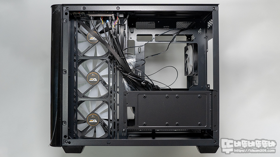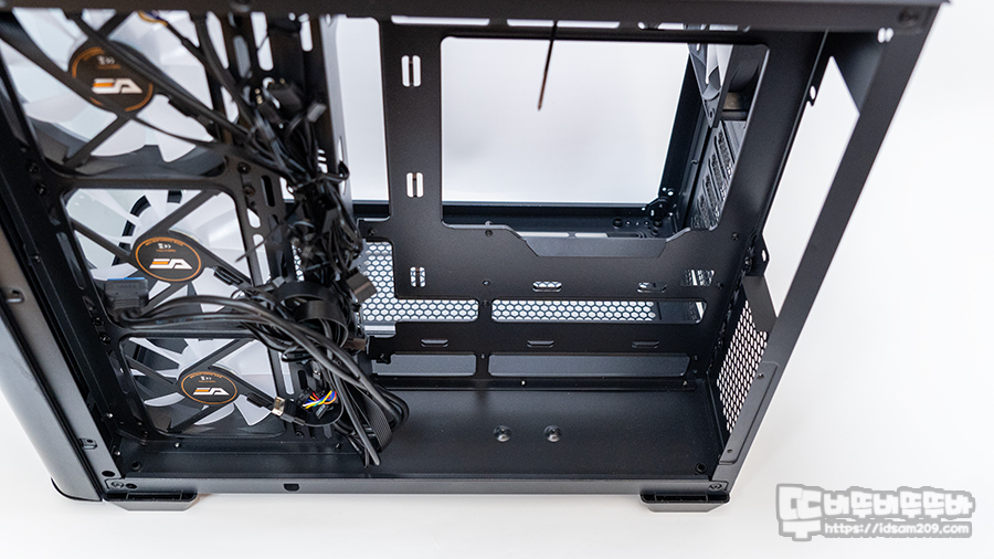 특히 메인보드가 장착되는 부분이 측면 쿨러가 장착되는 부분보다 돌출되어 있어 샤시 뒷면에 파워서플라이나 케이블을 정리하는데 여유 있는 작업이 가능합니다.