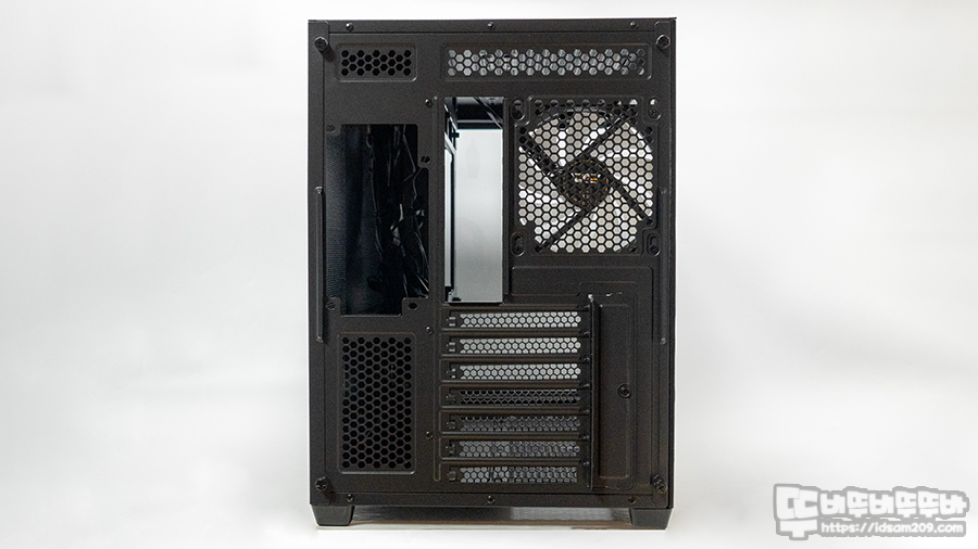 샤시 후면을 살펴보면 파워서플라이가 세로로 들어가는 부분과 메인보드가 장착되는 부분이 분리된 듀얼 챔버 구성을 확인할 수 있는데요.