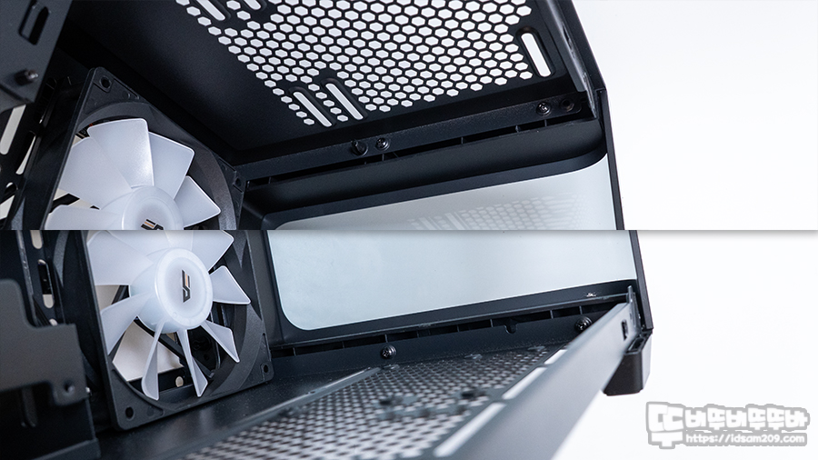 샤시 뒷면을 살펴보면 아랫부분에 SSD 2개 또는 HDD 1개를 장착할 수 있는 가이드가 기본으로 장착되어 있으며 가이드를 제거하면 의외로 넉넉한 공간을 제공합니다.