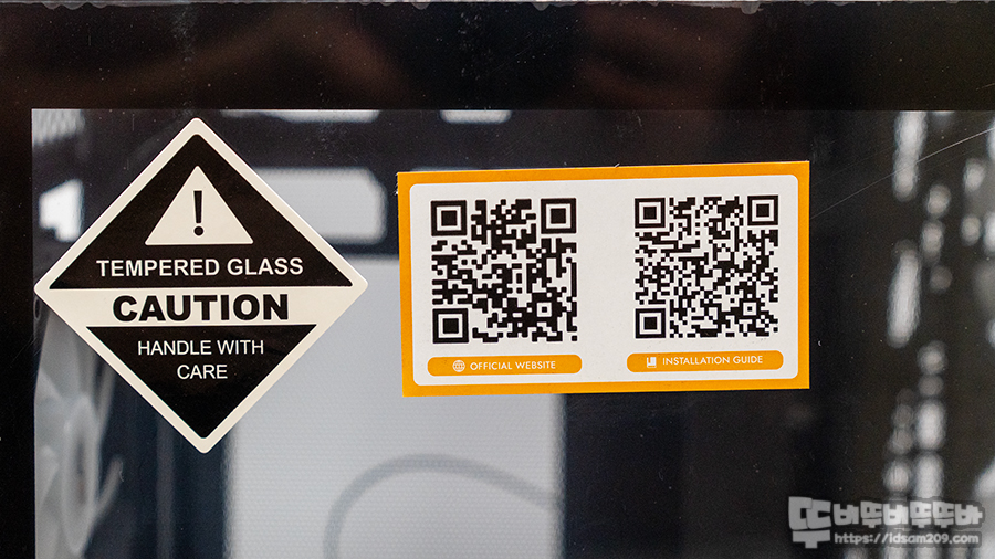 강화유리 사이드 패널에 부착된 주위 스티커와 설치 가이드 및 웹 사이드 QR 코드 스티커가 부착된 것을 확인할 수 있는데 케이스에는 조립 가이드 인쇄물이 없으니 시스템 조립에 숙달되신 분이 아니라면 QR코드를 활용하시는 게 좋을 거 같네요.