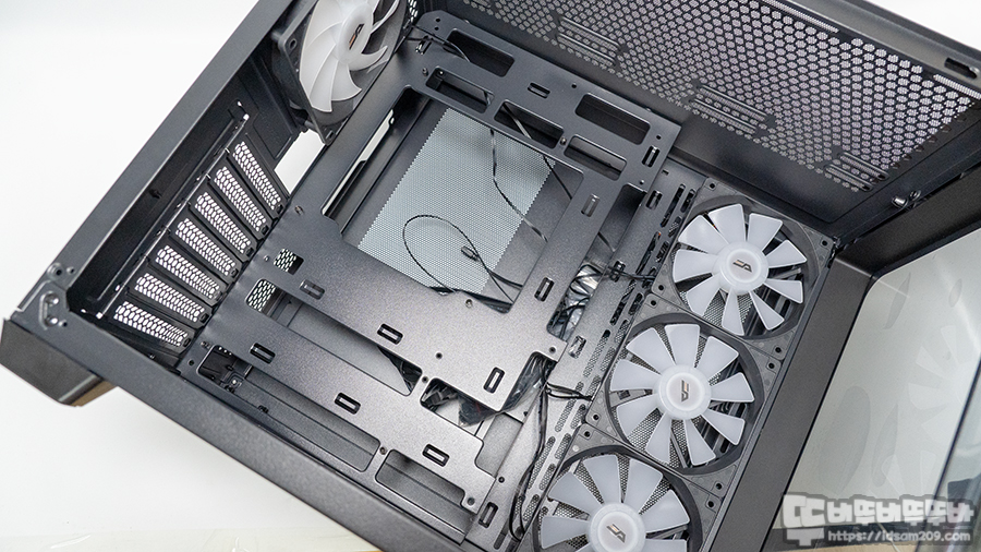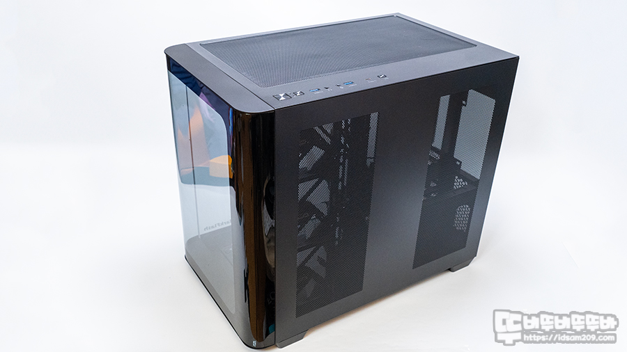 어항 케이스의 단점이라면 전면에 공기 유입이 안되기에 케이스 바닥면으로 공기가 유입되어 케이스 상단이나 측면으로 배기되는 형태지만 DPW90는 파워서플라이가 측면으로 장착되는 구조라 그런지 파워서플라이가 장착되는 부분도 타공 처리를 하여 공기 유입이 되게 설계한 게 특징인데요.