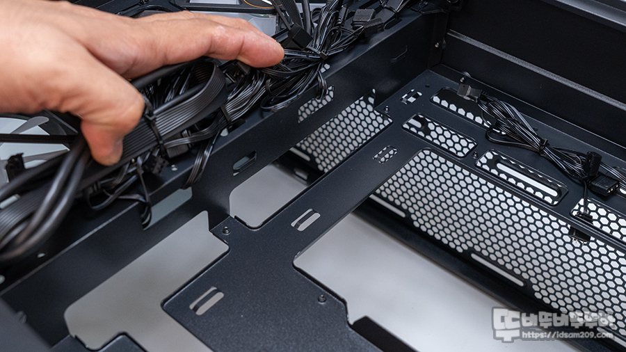 일반적인 메인보드를 사용한다면 파워서플라이 및 I/O 패널의 케이블을 수납하는 공간으로 사용되겠지만 메인보드의 커넥터가 뒤쪽에 위치한 BTF 메인보드를 사용한다면 각종 커넥터를 연결 후 케이블을 정리하는 공간으로 활용해야 하니 꼼꼼하게 케이블 정리를 하는 게 필요하네요.