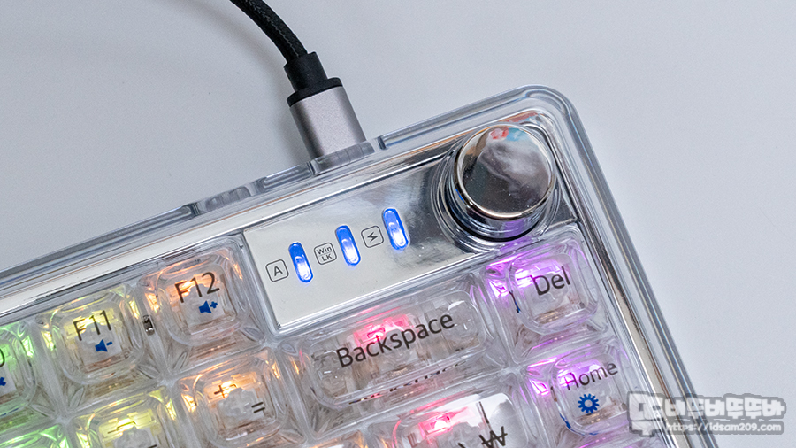 Caps Lock, Win키 Lock 시 점등, 충전 시 점멸로 표현되는 LED 인디케이터 모습.
