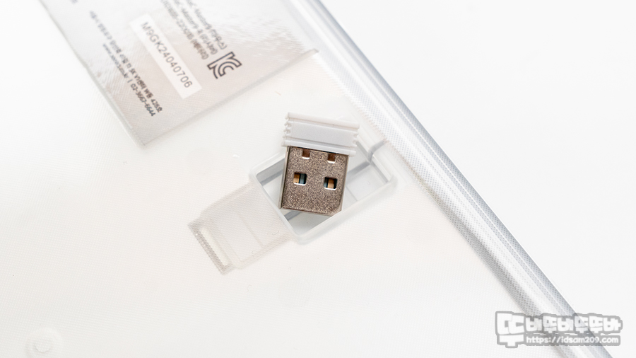 키보드 하판에는 미끄럼 방지 패드와 높이 조절 다리 그리고 중앙부에 RF 리시버를 보관하는 공간이 눈에 띕니다.