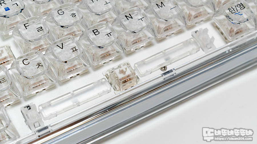 핫스왑 기판과 기본적인 윤활 그리고 클리어 키캡으로 RGB LED의 화려함이 돋보이는 제품으로 유선/무선 등 다양한 연결 방식을 이용하여 편리하게 사용할 수 있는 제품이지만 독특한 프로파일 키캡은 적응이 필요하니 참고하시고요.