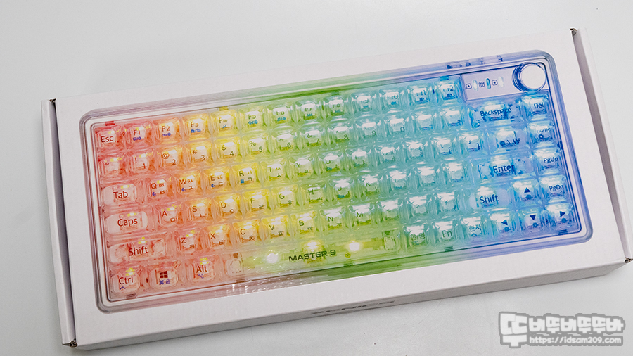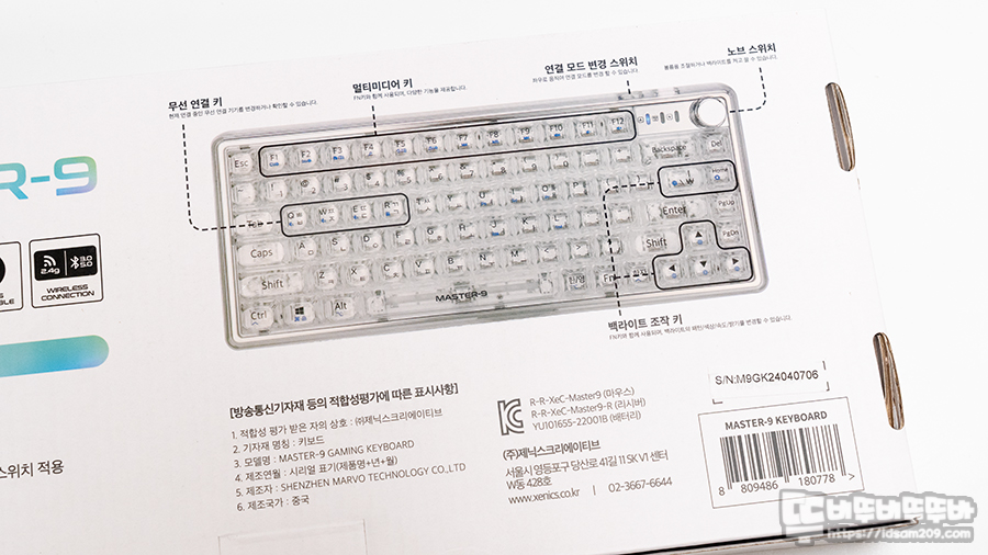 제닉스 Master 9는 최근 핫한 트렌드인 유/무선(블루투스, RF) 지원, 볼륨 노브, 크리스털 키캡을 통한 LED 투영이 화려한 제품인데요.