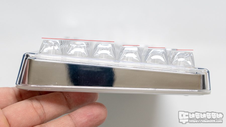 전체적으로는 SA 류의 프로파일 느낌이지만 키캡 표면 부분을 보면 스탭스컬처 2가 적용되지 않은 플랫한 형태로 키캡의 각도가 살짝 역방향으로 기울어진 부분이 있어 타이핑 시 높이 조절 다리를 세우지 않으면 살짝 애매한 느낌을 줍니다.