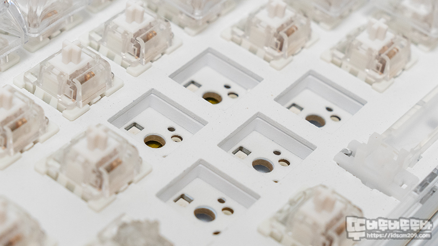 핫스왑 기판에 사용된 오테뮤 백축 스위치는 45g 키압의 리니어 방식으로 소음이 적어 살짝 저소음 느낌을 주지만 빠른 타이핑 시 반발력이 약하기에 구름타법으로 타이핑하시는 분이라면 키캡의 높이와 스위치 반발력으로 오타가 발생할 수 있으니 참고하시기 바랍니다.