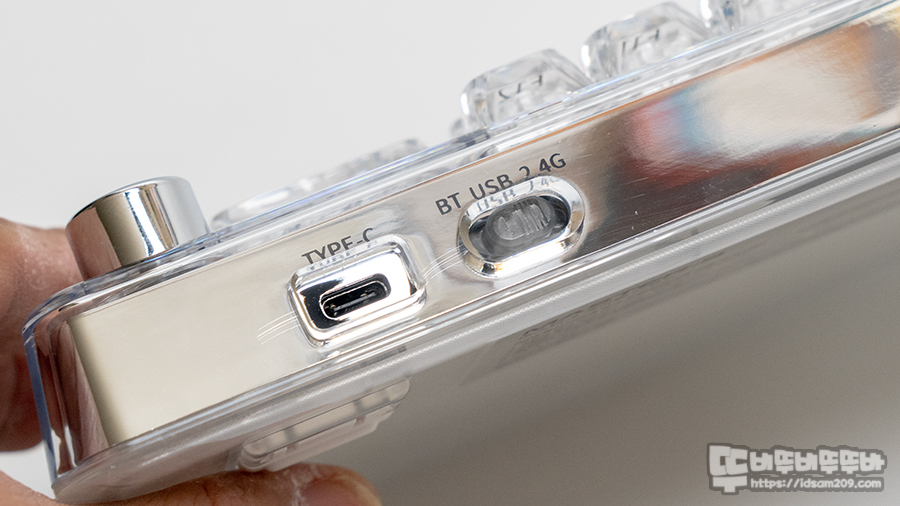 제품 상단에는 충전 및 유선 케이블을 연결하는 USB-C 단자 그리고 블루투스 / USB / RF 2.4 GHz 무선을 선택할 수 있는 셀렉트 스위치가 위치하고 있어 직관적인 선택이 가능합니다.