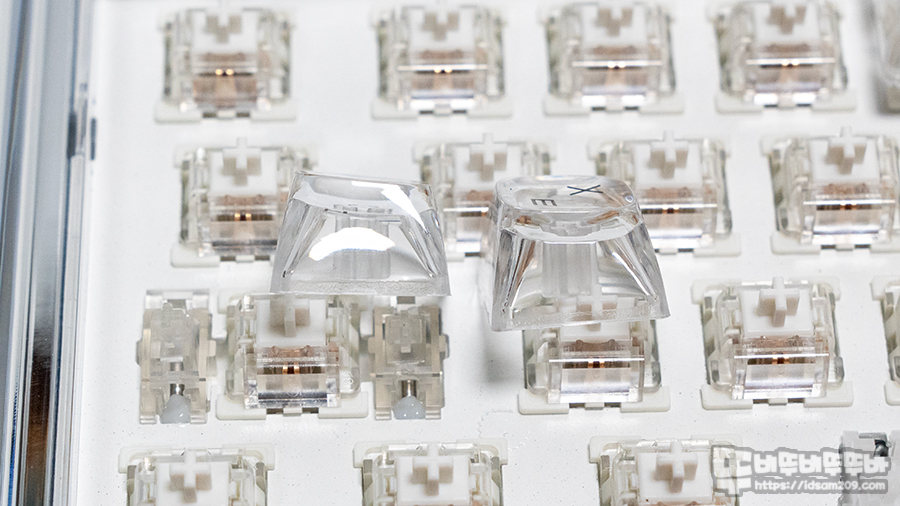 투명한 PC 소재 키캡에 실크스크린 방식의 한글 각인이 적용되었으며 불투명 각인 제품과 다르게 LED 백라이트가 키캡 표면에 머물지 않고 표면을 투과하는 형태가 되기에 생각보다 각인 눈에 잘 들어오지 않는 부분은 알고 계셔야 할 거 같네요.