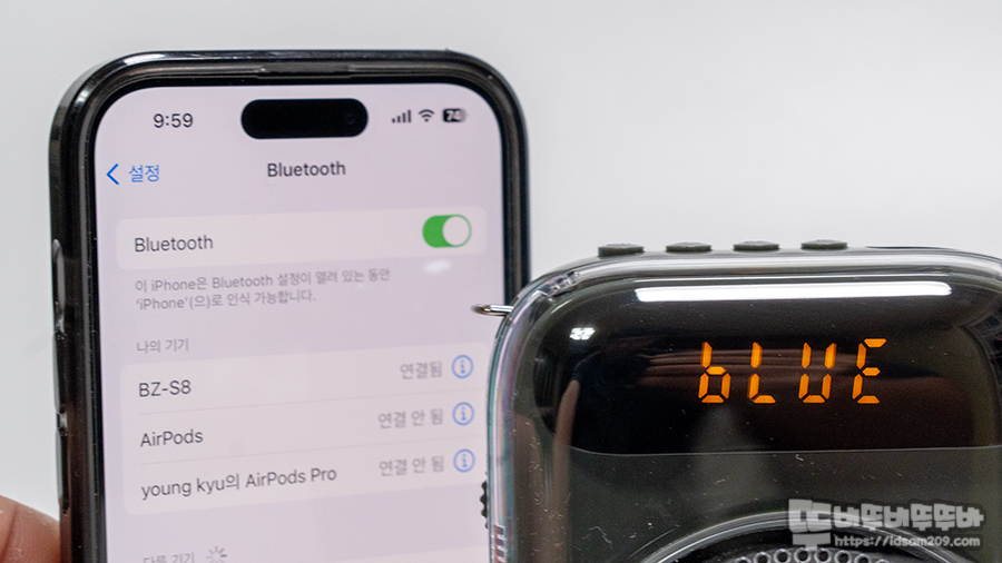 제품 상단에 M(멀티펑션) 버튼을 짧게 눌러 블루투스 모드로 최초 전환 시 자동으로 페어링 모드로 진입하며 스마트폰의 블루투스 기기 리스트에 등장하는 BZ-S8를 선택하시면 페어링이 완료됩니다.