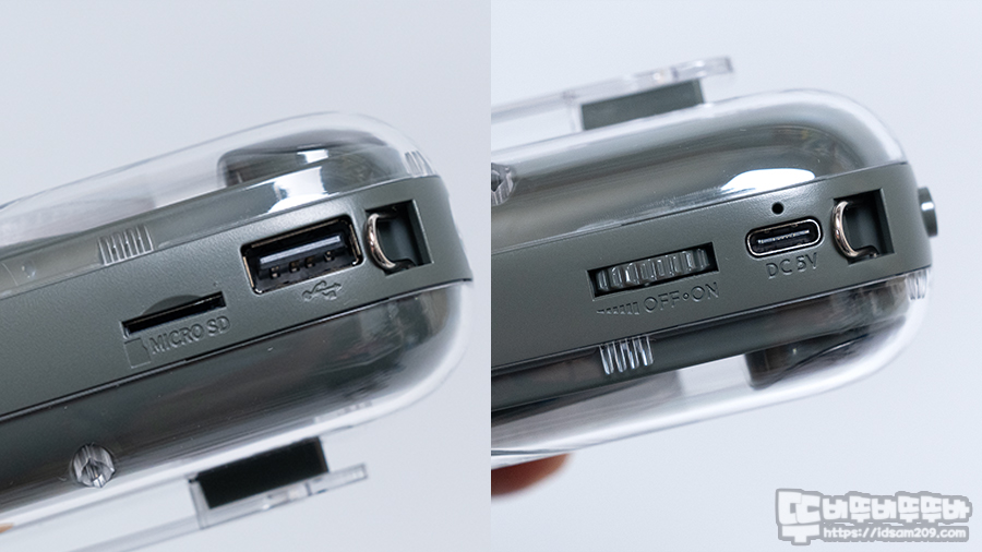 제품의 상단에는 멀티 펑션 버튼 M, 재생/일시 정지, 트랙 이동 버튼 그리고 AUX 외부 입력, MIC 입력 단자로 구성되어 있으며 왼쪽 측면에는 USB 메모리 & MicroSD(TF) 슬롯 그리고 오른쪽 측면에는 전원 On/Off 겸 볼륨 조절 노브, USB-C 충전 단자를 확인할 수 있습니다.