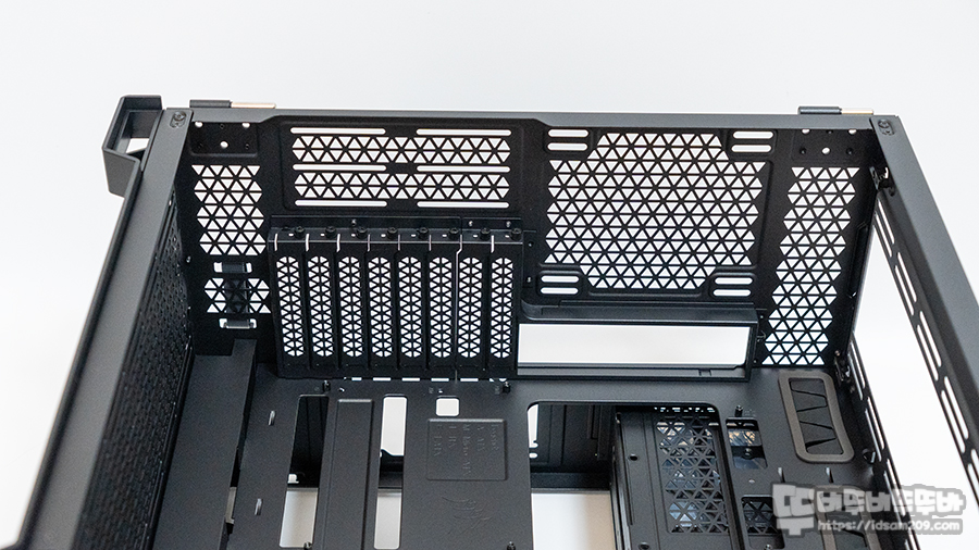 PCI 슬롯이 8개로 구성된 미들 케이스인 iCUE LINK 6500X RGB의 메인보드 결합하는 샤시면에 타공이 많은 것을 확인할 수 있는데 현재 많이 사용하는 일반 메인보드뿐만 아니라 ASUS BTF, MSI Project Zero와 같이 일부 브랜드에서 출시한 역방향 커넥터로 구성된 M-ATX와 ATX 메인보드 제품 사용을 고려한 디자인이 적용된 것이 눈에 띄네요.