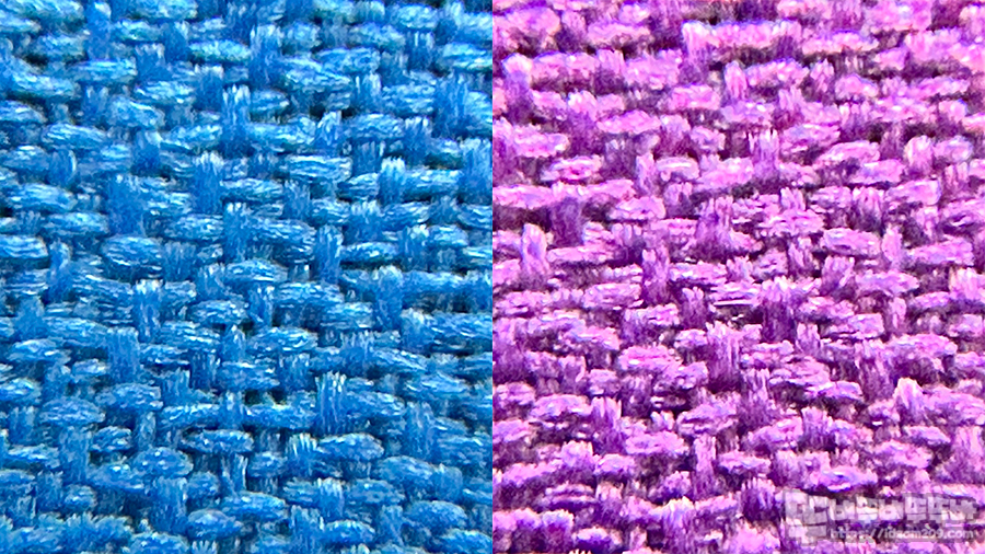 확대경으로 표면을 살펴보면 아문젠 방식의 직물을 확인할 수 있는데 아문젠 직물의 특징이라면 불규칙하게 돌출된 모직의 돌기가 있어 X축 또는 Y축, 원형 회전, 대각선 등 어떤 방향으로 움직여도 균일한 편입니다.