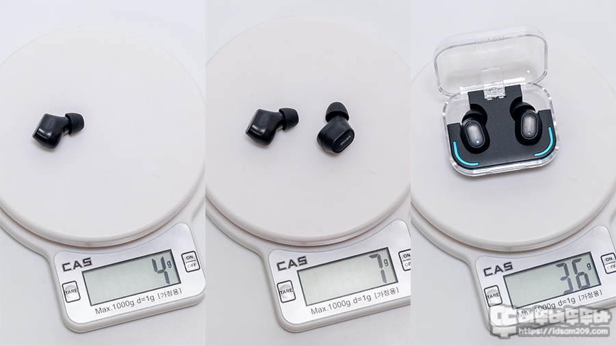1g 단위로 측정 가능한 디지털 저울로 측정 시 이어버드 한쪽 3.5g, 양쪽 7g , 충전 케이스 29g, 총 36g 무게를 확인할 수 있네요.