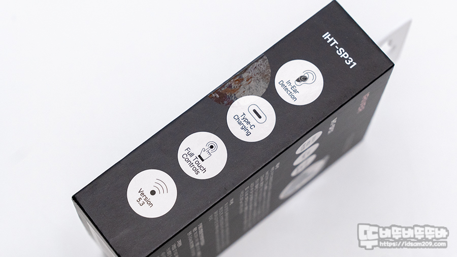 패키지 측면에는 제품의 특징인 인이어 감지, Type-C 충전, 터치 컨트롤, 블루투스 버전 5.3을 강조하고 있네요.