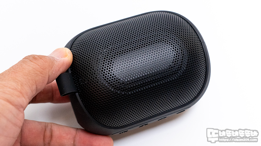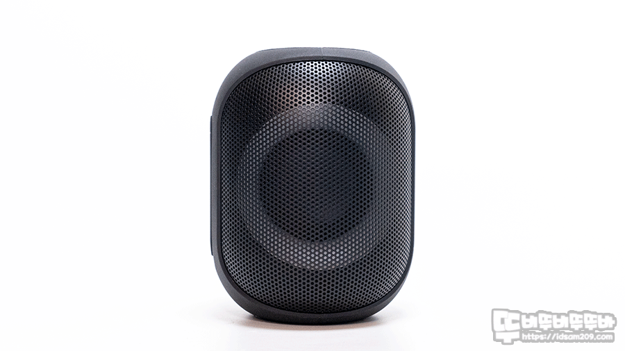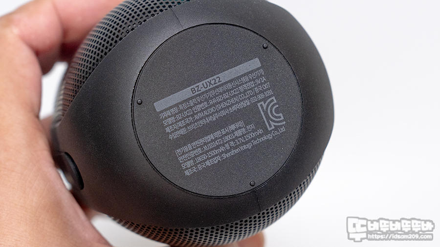 흡사 원통형이지만 살짝 타원형 느낌으로 86 X 83 X 108mm 높이로 아담한 크기의 BZ-UX22는 전면에는 50mm 드라이브 유닛, 뒷면에는 패시브라이디이터가 위치하고 있으며 앞뒤 부분은 메탈소재 그릴 그리고 중앙 부분은 실리콘으로 커버되어 있는 디자인이지만 IPX7 방수를 지원하는 게 특징입니다.
