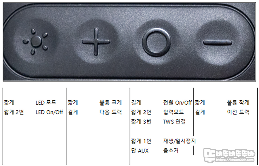 컨트롤 버튼은 짧게, 짧게 2번/3번, 길게 누르는 방식으로 다양한 기능으로 사용되는데 AUX 입력으로 사용 시 전원 버튼을 누르면 블루투스나 MicroSD에서 작동하는 기능과 다르게 음소거로 작동되니 참고하시기 바랍니다.