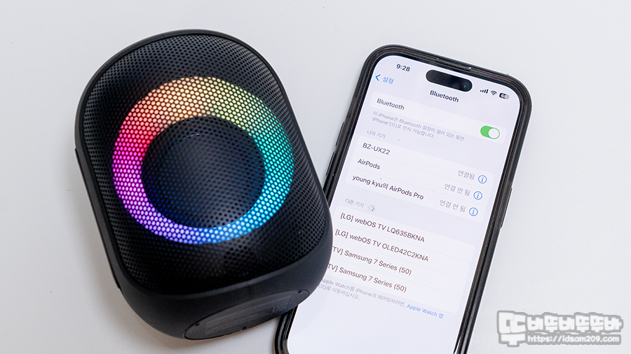 스피커의 전원을 켜면 스마트 기기의 블루투스 기기 리스트에 등장하는 "BZ-UX22" 기기를 선택하면 페어링 가능한데 최초 페어링 이후에는 스피커 전원을 켜면 오토 페어링으로 편하게 사용할 수 있고요.