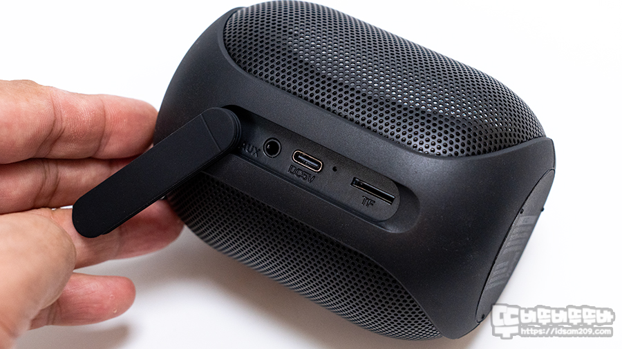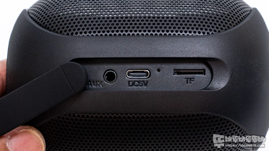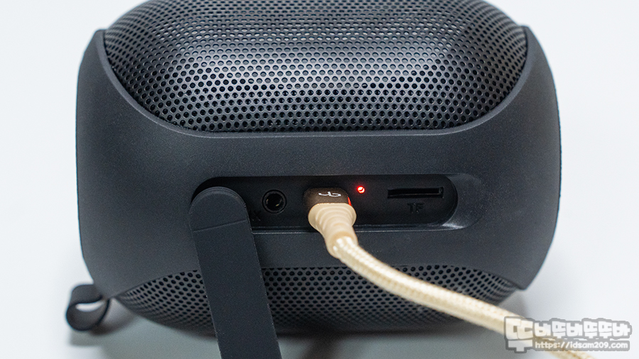 실리콘 소재가 사용된 버튼부 그리고 후면에 실리콘 커버를 오픈하면 충전/LED 인디케이터, TF-Card (MicroSD), AUX-in 단자가 내장되어 있는데 두툼한 실리콘 커버가 방수 역할을 확실히 해주네요.