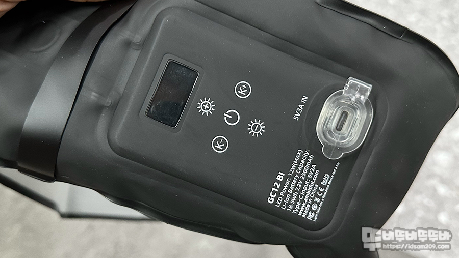오른쪽 끝부분의 컨트롤 부분은 밝기와 색온도 그리고 USB-C 단자가 보호 캡으로 덮여있습니다.