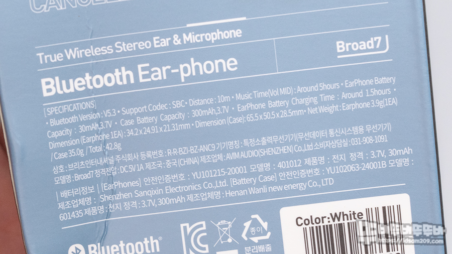 블루투스 버전 5.3 / 지원 코덱 SBC / 드라이버 유닛 13mm / 배터리 : 이어버드 30mAh x2, 충전 케이스 300mAh / 충전시간 1.5시간 / 사용시간 50% 볼륨 사용 시 5시간 ANC 사용 시 4시간 등의 정보를 확인할 수 있고요.