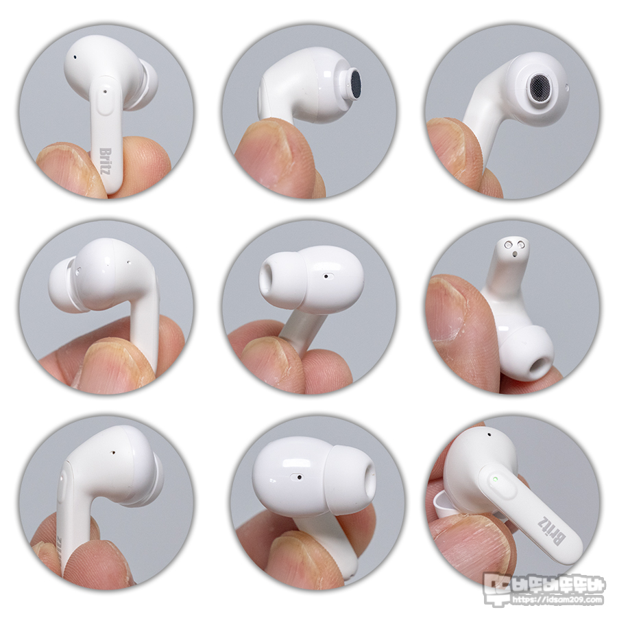 무선 이어버드의 헤드 안쪽과 바깥쪽에는 노이즈 캔슬링 관련 마이크 홀 그리고 스틱 끝부분에는 충전 단자와 음성 통화용 마이크 홀을 확인할 수 있으며 스틱 상단에 볼록 튀어나온 터치센서가 내장된 컨트롤 부는 LED 인디케이터가 내장되어 페어링 상태 및 작동상태를 확인할 수 있습니다.