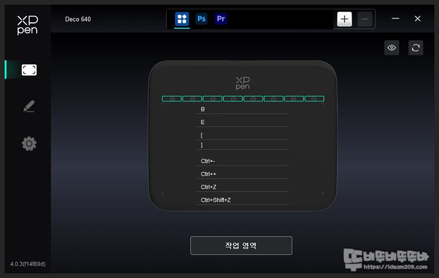 특히 XP PEN Deco 640 펜 타블렛의 경우 8개의 단축키 설정이 가능한 버튼을 지원하는데 전용 소프트웨어의 메뉴에서 1~8까지 버튼에 키보드 키, 단축키, 응용 프로그램 설정이 가능하여 작업을 하면서 스타일러스 펜으로 간편하게 사용이 가능한데요.