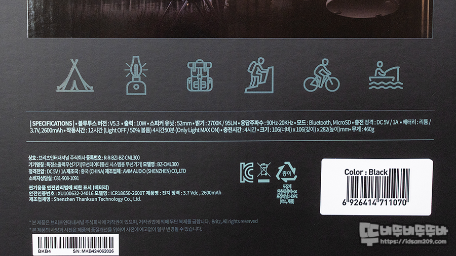 패키지 측면에는 제품의 블루투스, LED 랜턴, 인/아웃도어 캠핑 스피커로 제품의 아이덴티티를 표현하고 습니다.