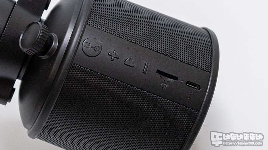 컨트롤 기능은 전원 버튼 / 모드 변경(블루투스/MicroSD), 볼륨/트랙 이동, 재생/일시 정지 컨트롤 그리고 MicroSD 메모리 슬롯, USB-C 전원 단자로 구성되어 있고요.