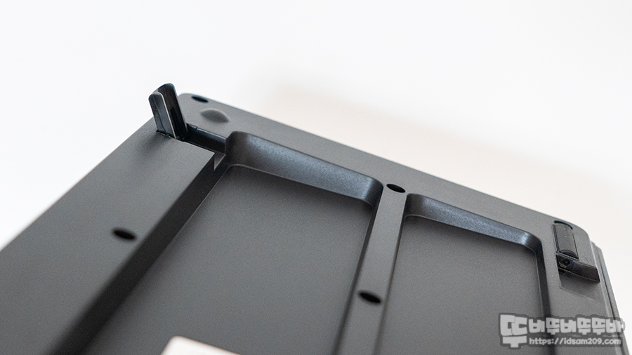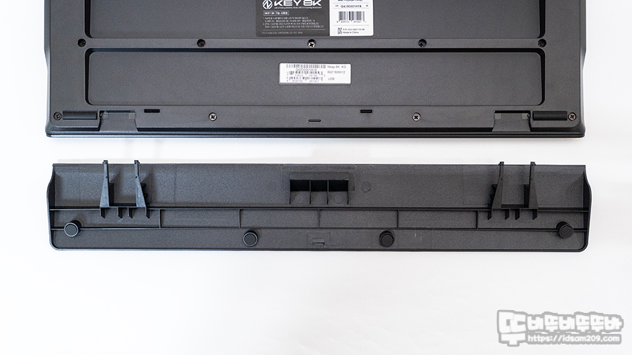 키보드의 바닥면은 뒤틀림을 방지하는 홈이 적용되어 안정적이며 바닥면에는 높이 조절 다리와 아부분에 미끄럼 방직 패드 그리고 침수가 되었을 때 배수구 모습을 확인할 수 있습니다.