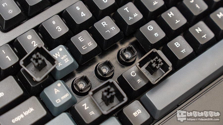 맴브레인 방식이기에 키캡 각인은 실크인쇄 방식으로 처리가 되어있으며 스테빌라이저 부분은 팩토리 윤활 처리가 되어 있어 키가 눌릴 때 철심 소리를 최소화해 주네요.