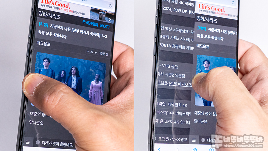 전체적인 액정화면의 터치하는 부분에서 작동이 잘 되는 편이나 오른손으로 아이폰을 사용하면서 한 손 제어를 하는 경우 엣지면에서 시작하는 화면 넘김이 랜덤하게 작동되지 않는 문제를 확인할 수 있었습니다.