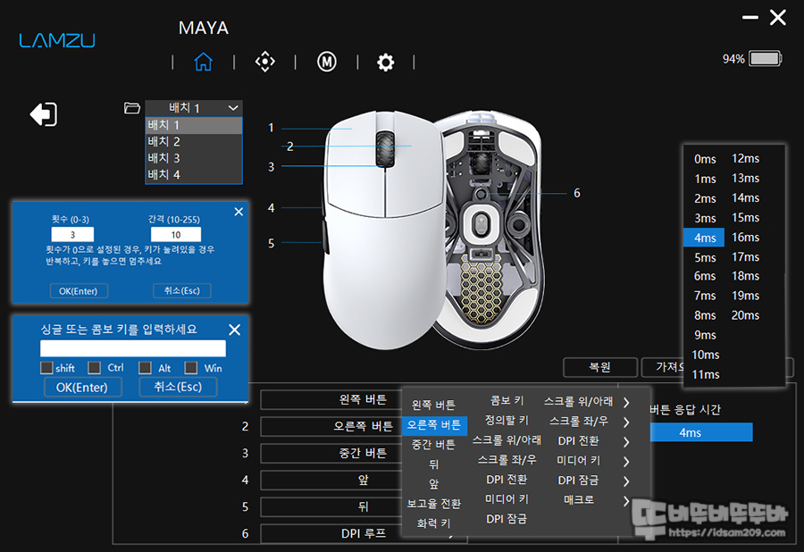 4개의 프로파일과 0~20ms 버튼 응답시간, 6개의 버튼을 다양한 기능으로 커스터 마이징이 가능한데 화력 키와 콤보 키는 게임이나 응용프로그램을 이용할 때 유용할 수 있으니 참고하시면 좋을 거 같네요.