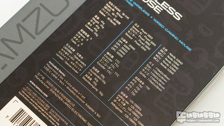 센서: Pixart PAW3950 / MCU: Nordic nRF52840 / 최대 폴링 레이트: 1,000 Hz(무선) / 1,000Hz(유선) (4K, 8K 무선 동글은 별매) 최대 DPI: 30,000 DPI / 최대 가속도: 50G / 메인 스위치 : OMRON 옵티컬 스위치 / 휠 인코더: TTC Silver / 보증기간 2년을 확인할 수 있고요.