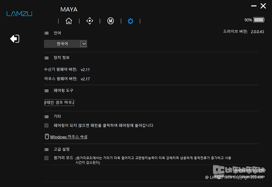 환경 설정 메뉴에서는 펌웨어와 페어링 기능이 있지만 동글 선택에 사용하는 방법은 제품 판매 페이지 상세 내역을 참고하시기 바랍니다.