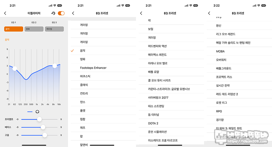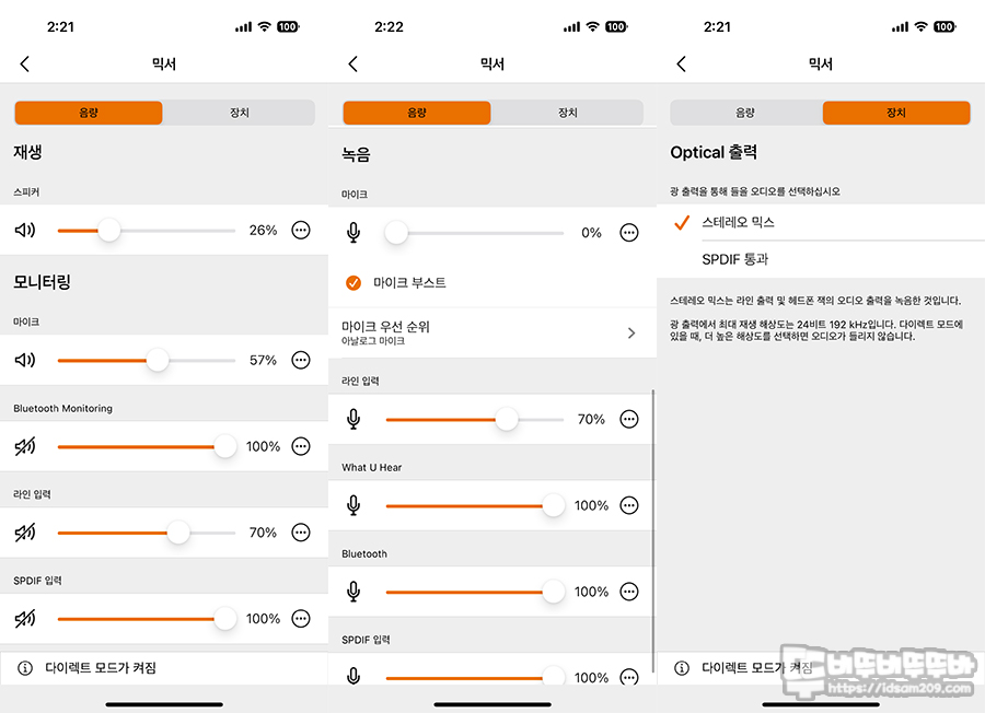 믹서 메뉴에서는 다양한 입력 모드의 볼륨과 마이크 볼륨 그리고 옵티컬 출력에 대한 설정 그리고 다양한 EQ 선택이 가능하니 잘 활용하시기 바랍니다.