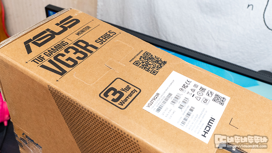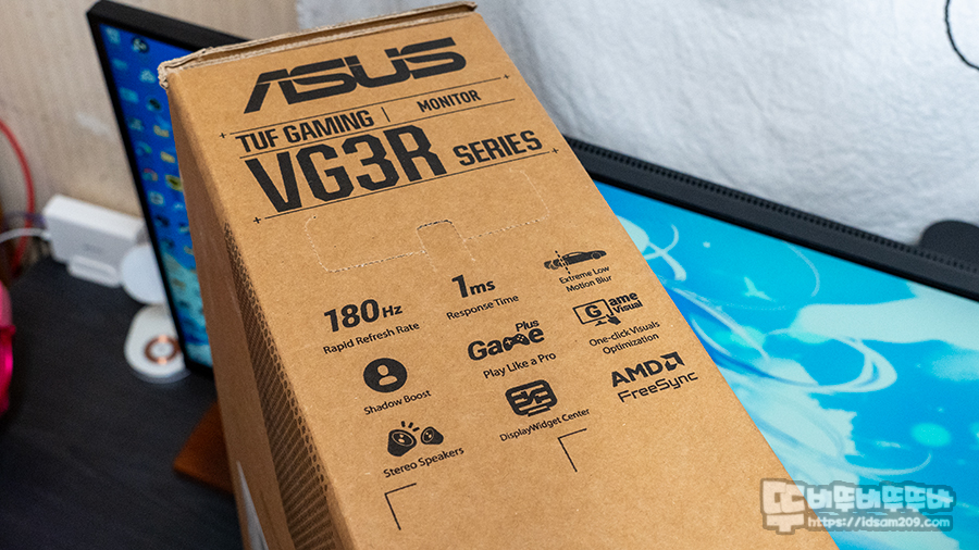 제품의 패키지는 TUF GAMING의 로고를 형상화하는 이미지에 VG279Q3R 모델명에 일부를 표현하는 VG3R 시리즈 그리고 모니터의 크기인 27인치 정보를 확인할 수 있고요.