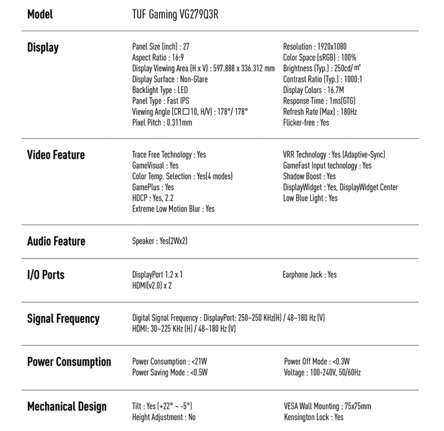 16:9 1920 X 1080 Full HD 27인치 / Non-Glare / Fast IPS 패널 / 도트 피치 0.311mm / 명암비 1000:1 / 응답속도 1ms(GTG) / 180Hz 지원 / 플리커 프리 / 게임 플러스 / HDCP 2.2 / 익스트림 로우 모션 블러 / AMD Free Sync / 쉐도우 부스트 / 디스플레이 엣지 / 블루 라이트 등 게이밍에 최적화된 기능을 지원합니다.