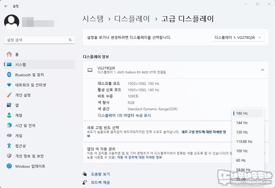 180Hz 설정은 바탕화면 우클릭 - 디스플레이 설정 - 고급 디스플레이 항목에서 새로 고침 빈도 선택을 통해 최대 180Hz 선택이 가능하니 잘 활용하시기 바랍니다.