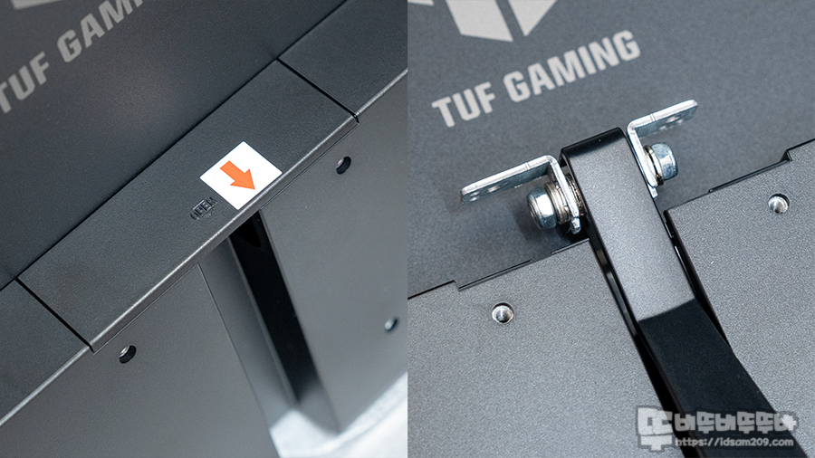 모니터 스탠드는 상단부에 커버를 화살표 방향으로 오픈 후 스탠드를 위에서 아래로 결합하면서 고정나사로 고정 후 커버를 덮어주면 간단하게 결합이 마무리됩니다.