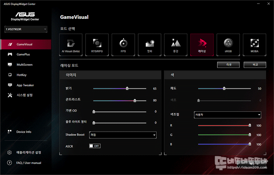 보통 모니터 색감 여러 가지로 구분하고 있는 기능을 이 모델에서는 게임 비주얼로 표현하고 있으며 다양한 컬러 설정값에 따라 다양한 색감을 경험할 수 있으며 그중에서 sRGB 컬러도 지원하고 있으니 표준 색감을 원하시는 sRGB를 선택하시면 좋습니다.