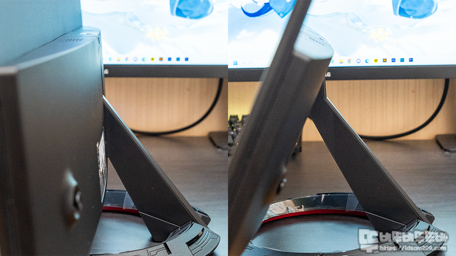 모니터의 패널 상단부는 상당히 얇게 디자인되었고 아래쪽에 AD 보드와 파워 보드가 들어간 구조라 아래쪽에 살짝 두툼한 편인데 이 부분을 기준으로 -5~ +22도 각도의 틸트를 지원합니다.